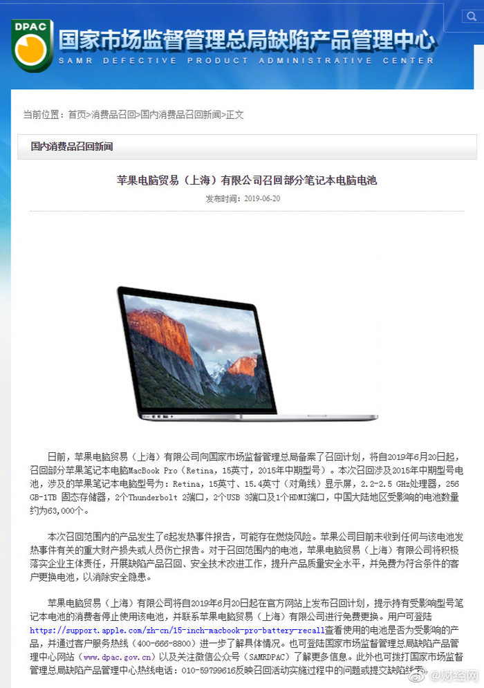@财经网:日前,苹果电脑贸易(上海)有限公司向国家市场监督管理总局备案了召回计划,将自6月20日起,召回部分苹果笔记本电脑MacBook Pro(Retina,15英寸,2015年中期型号)。中国大陆地区受影响的电池数量约为63,000个。本次召回范围内的产品发生了6起发热事件报告,可能存在燃烧风险。苹果提示持有受影响型号笔记本电池的消费者停止使用该电池,并联系公司进行免费更换。
