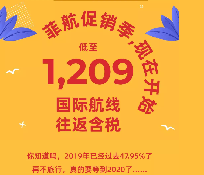 菲航促销季,现在开始,低至1209,国际航线往返含税总价,今年下半年的旅行,现在就可以啊那排起来了!