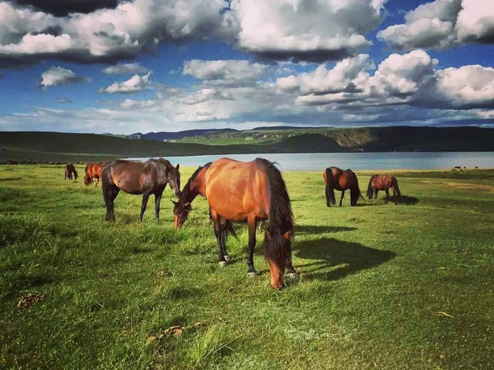 这里是世界上历史最悠久的马场,更是历代皇家军马养殖基地。不远处是著名的祁连雪山和焉支山。雪山,碧湖,草原,自由撒欢的马儿。天旷地辽,野阔云低,大西北的苍茫豪犷之美让人眼界心胸豁然辽阔,只想纵马扬鞭,驰骋一回。