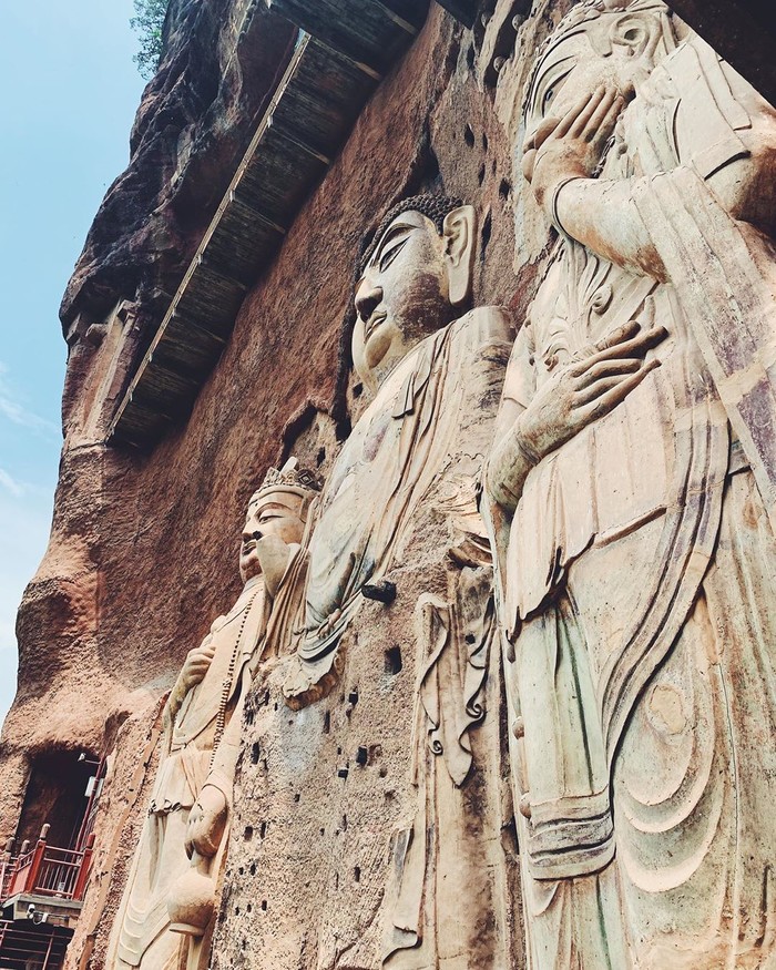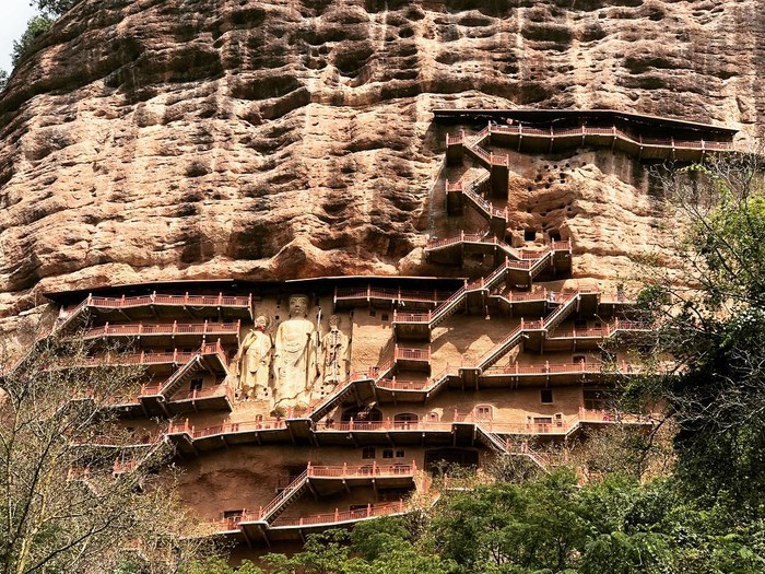 不同于莫高窟风沙中的遗世独立,麦积山石窟是凿于绝壁。那陡崖峻壁上开凿而成的成百上千蜂窝似的洞窟和佛像给人带来强烈的视觉冲击。