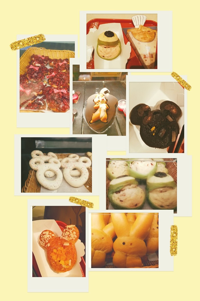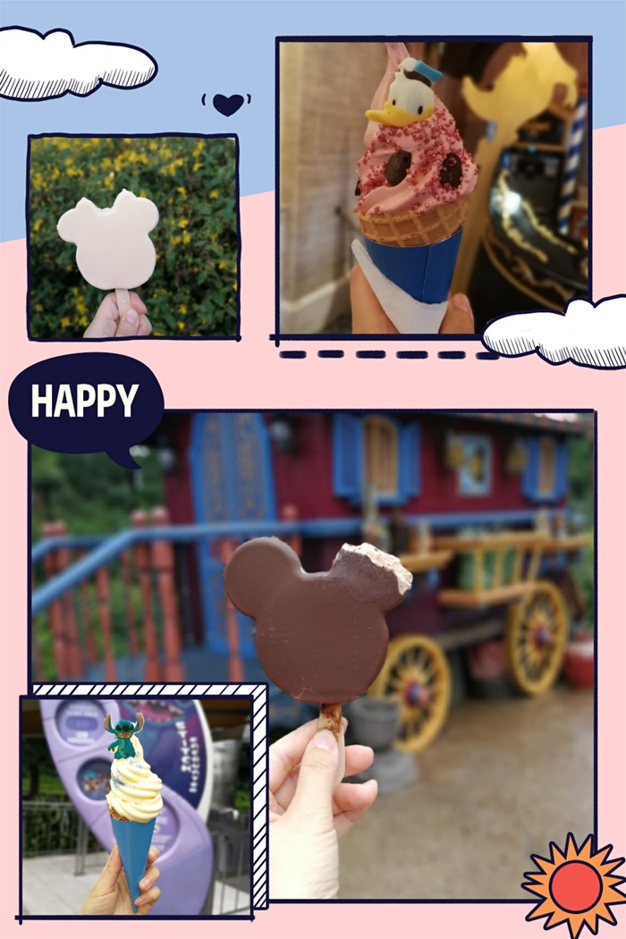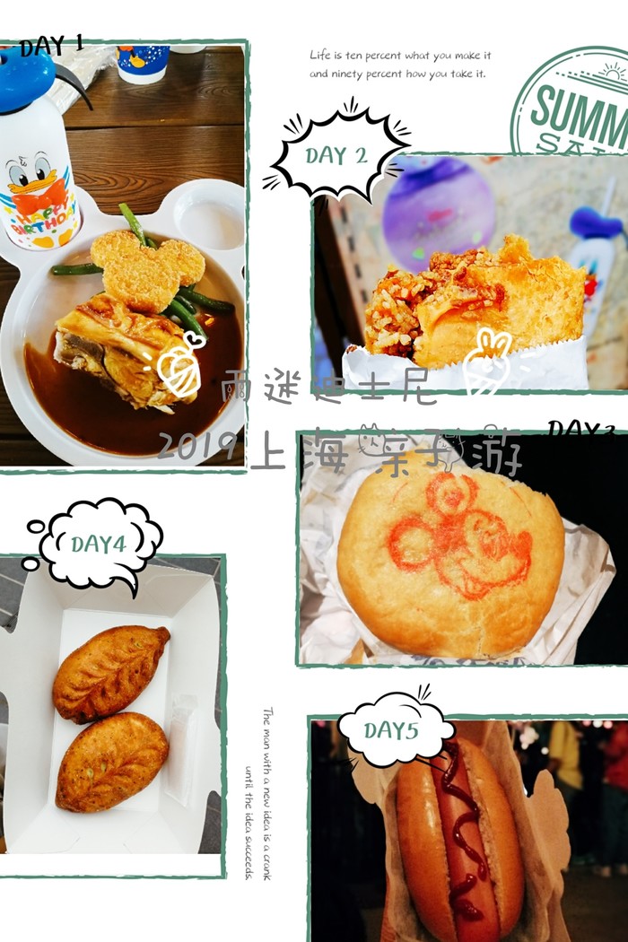 【美食篇】乐园内的小吃基本上都尝了一下,推荐烤包子(具体忘了叫什么名字了,就是下图左下角那两个),但是70元两个太贵了!米奇的雪糕都好吃,40一支,贵点也得吃