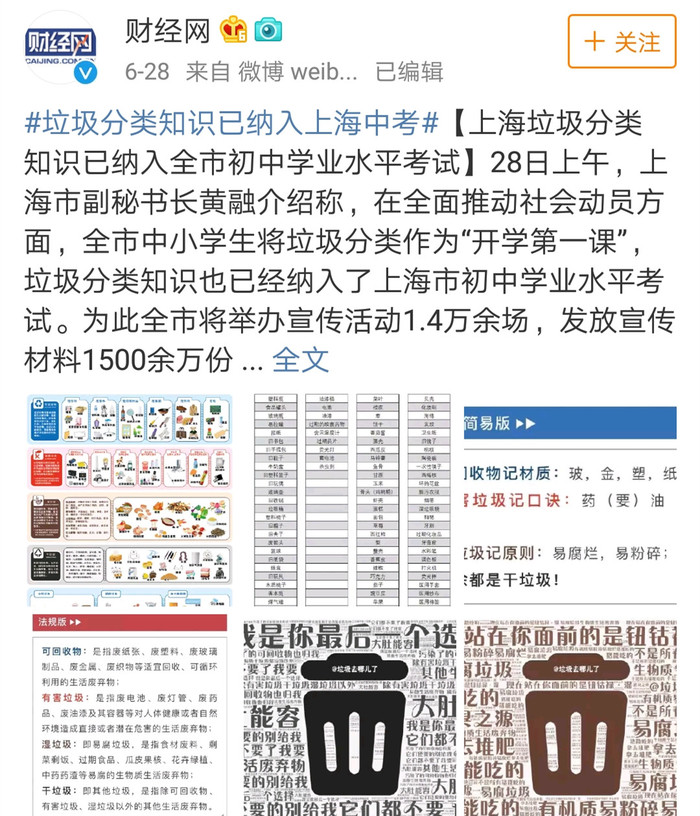而娃娃没抓好,也会输在起跑线上。上海已经决定,全市中小学将垃圾分类作为“开学第一课”,垃圾分类知识也已经纳入了上海市初中学业水平考试。
