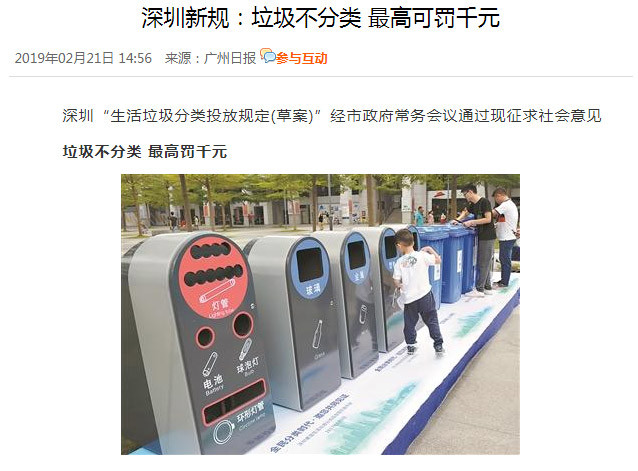 今年2月,深圳在垃圾分类投放新规的草案中,把拒不改正者可处罚款50-100元提高10倍至500-1000元。