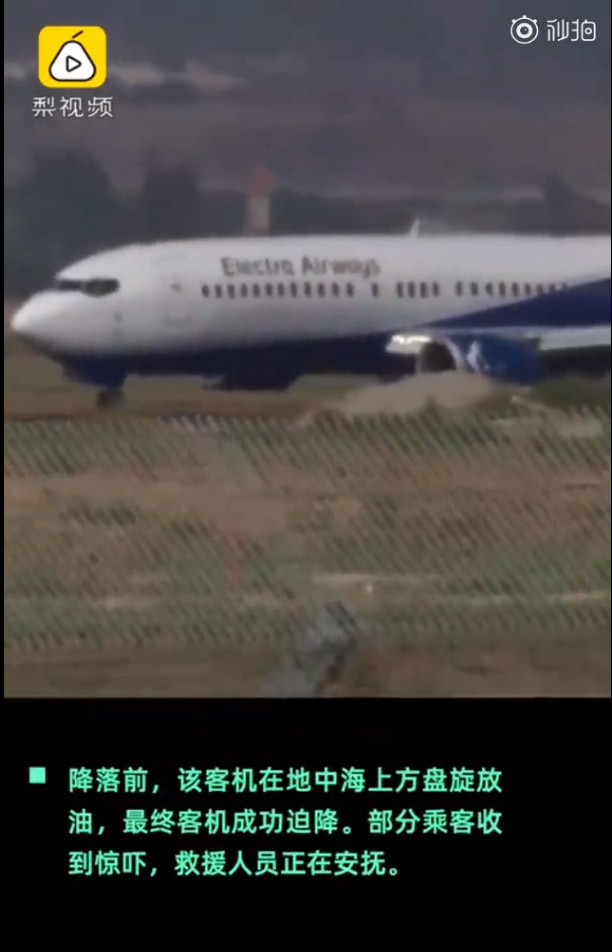 @梨视频:据RT报道,7月1日伊莱克特拉航空一架波音737-400客机在以色列本古里安机场迫降,该客机共载152人,从德国科隆起飞时轮胎爆裂,随即启动最高级警报;以方派出救援人员待命,最终客机安全着陆,部分乘客受到惊吓。