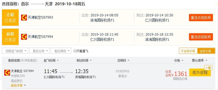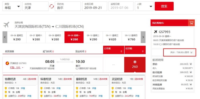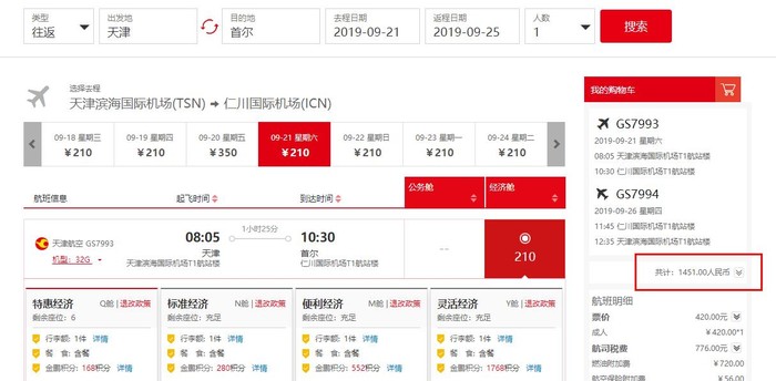 天津-首尔,天航官网单程含税738元,往返含税1451元;