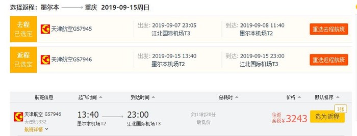重庆=墨尔本,往返含税3243元,跨中秋;