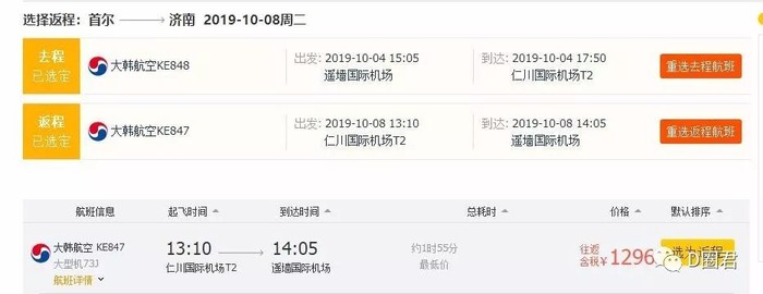 烟台=首尔,往返含税1345元,10月3日-7日;