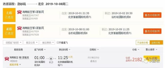 北京=洛杉矶,往返含税2.1K,10月1日-8日,