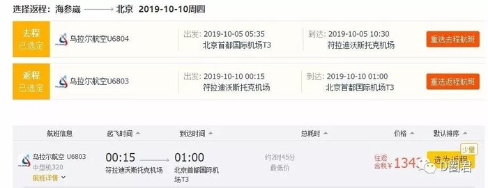 北京=海参崴,往返含税1.3K,10月5日-10日;