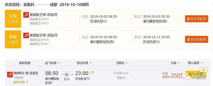 成都=莫斯科,往返含税2.5K,10月2日-10日;