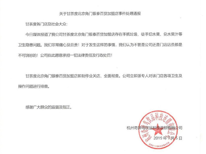 @甘茶度 官方微博发布处理通报称,涉事加盟店即刻停业关店、全面彻查。