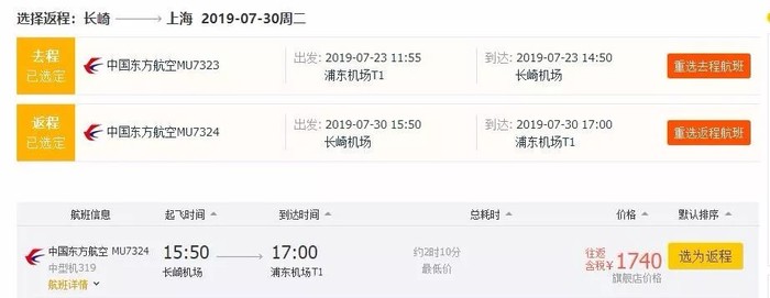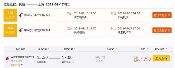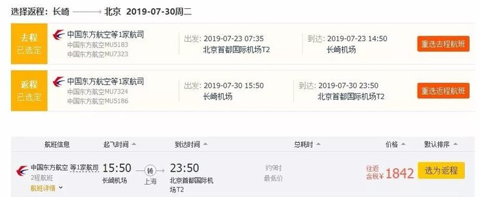 上海=长崎,往返含税1.7K,东航执飞,7~9月多日期有票;
