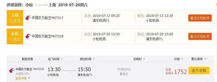 上海=小松,往返含税1.7K,7月13日-20日;