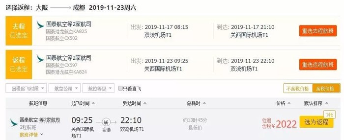 成都=大阪,往返含税2K,11月17日-23日,国泰航空执飞,