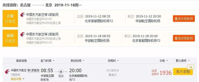 北京=名古屋,往返含税1.9K,11月12日-18日;