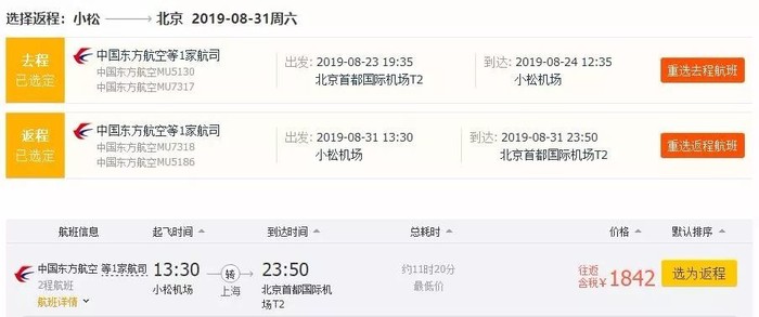 北京=小松,往返含税1.8K,8月23日-31日;