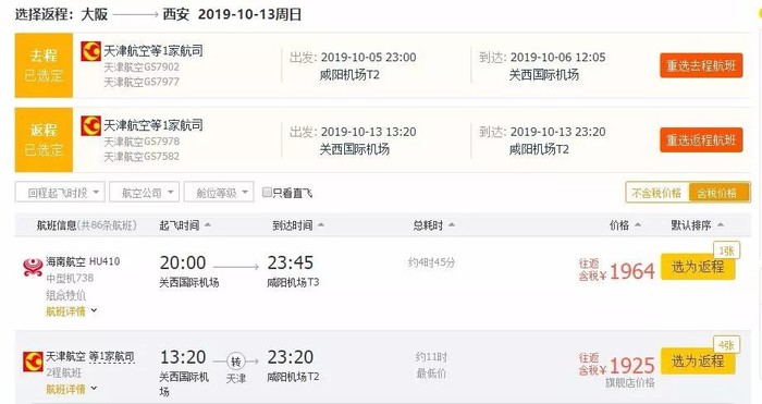 西安=大阪,往返含税1.9K,10月5日-13日;