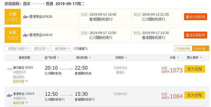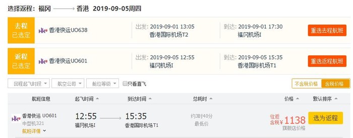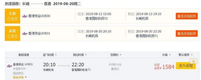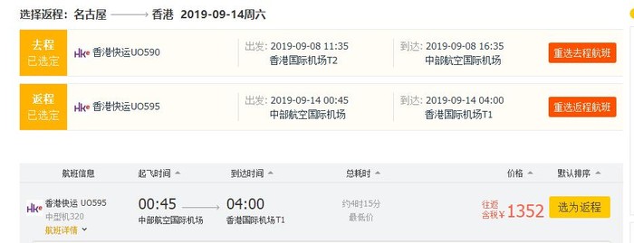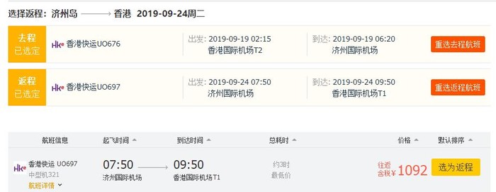 - 选择去程航班,寻找刻有HKD 0 的回程机票。