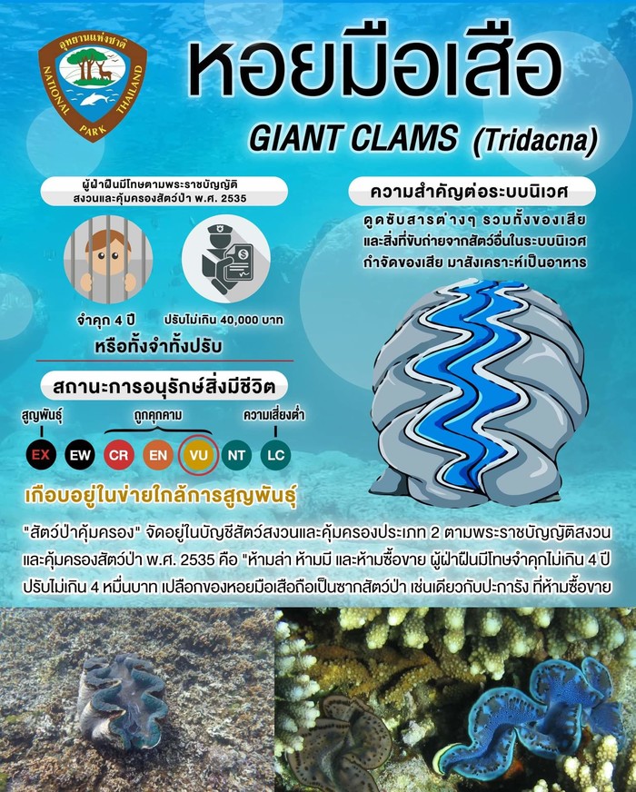 砗磲是濒危物种,受到1992年泰国《野生动物保护法》的保护。违反者最高可被处以4万泰铢(约合人民币9000元)的罚款或4年监禁。该种类全部种列入《世界自然保护联盟》(IUCN) 2013 年濒危物种红色名录 Ver 3.1。全部种列入《华盛顿公约》CITES 附录 Ⅱ 级保护动物。