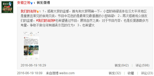 当时《我们的法则》节目组通过微博进行回应,称节目中的小型砗磲,是常见的食用贝类。