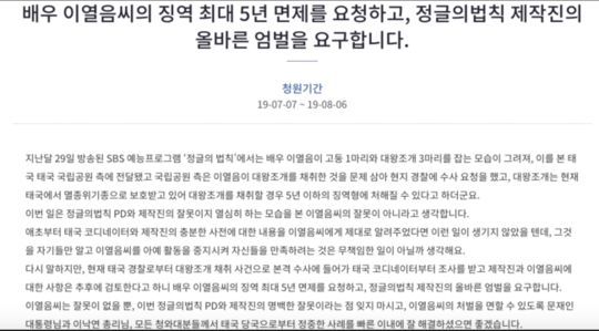 其中有一位网友在青瓦台进行了国民请愿,标题就是“请免除女演员李烈音最多五年的监禁处罚,对《丛林的法则》节目组进行严惩”,并表示这件事情错不在李烈音,而在于《丛林的法则》的导演和制作组。