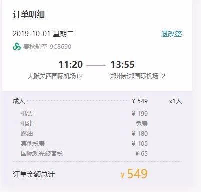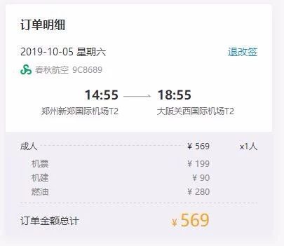 郑州-大阪,单程含税569元;大阪-郑州,单程含税549元;往返含税1118元;