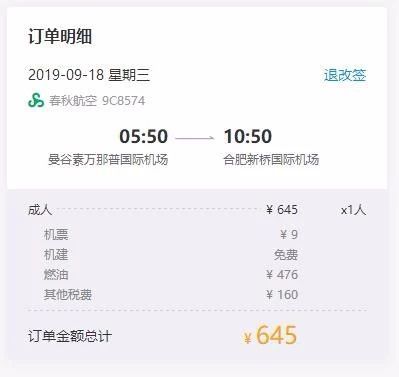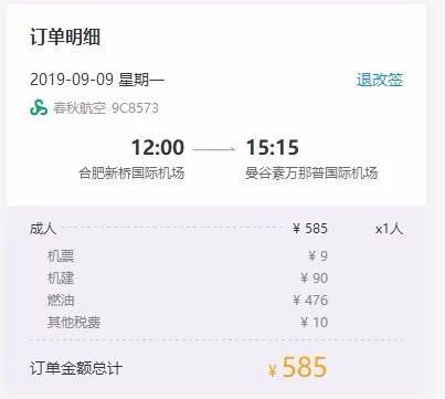 合肥-曼谷,单程含税585元;曼谷-合肥,单程含税645元;往返含税1230元;