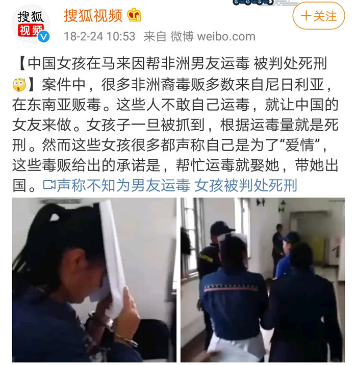 去年年初,一则“中国女孩在马来西亚帮非洲男友运毒被处以死刑”的新闻也引起热议。