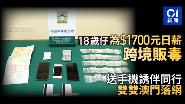 上个月初,还有两男一女港人,涉嫌于澳门贩毒被司警拘捕,其中2名被捕男子分别18及15岁,其中18岁姓韩男疑犯供称因欠债收取日薪1,700港元犯案,并以「送手机」方式利诱15岁男友人陪同作案。