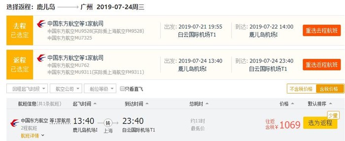 此外,广州=鹿儿岛,7月出行含税往返1069元
