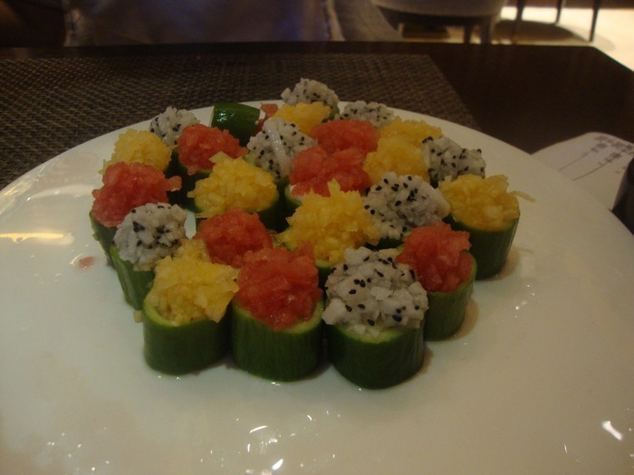 这个地方有两个值得去试试的点。一个就是它的菜品!御膳园有很多很可的工艺菜,来说说这个深得我心的“贵妃醉酒”。这个是把青瓜切成空心的小段,里面装了杏仁和炼乳,上面是各种颜色的水果粒。吃起来很清爽,很时候在大口吃肉之后解腻。