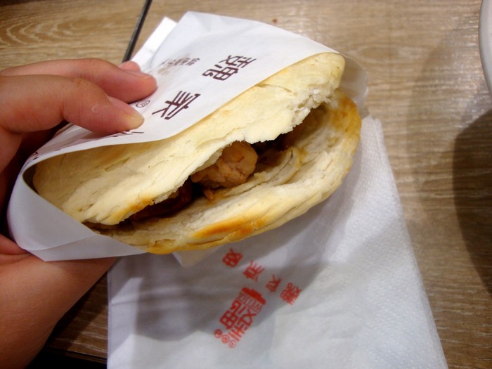 还有一种是魏家凉皮的肉夹馍。这个肉夹馍的馍特别酥脆,吃起来很香。不过肉吧,就一般般的有点少。不过它的馍是真的超赞!