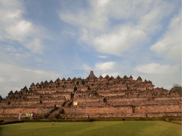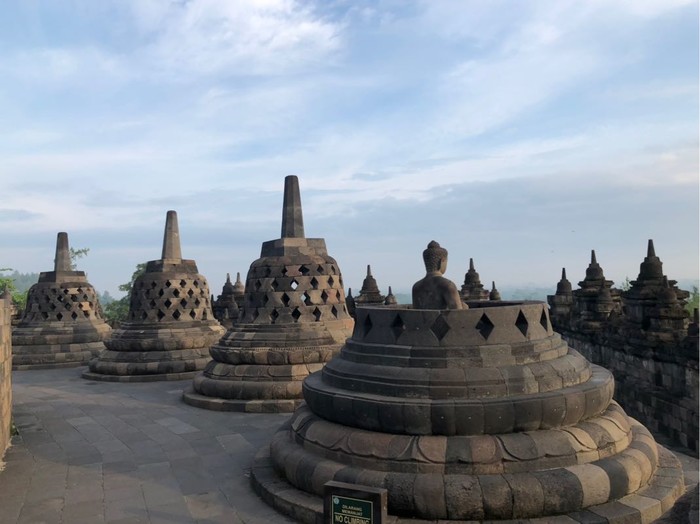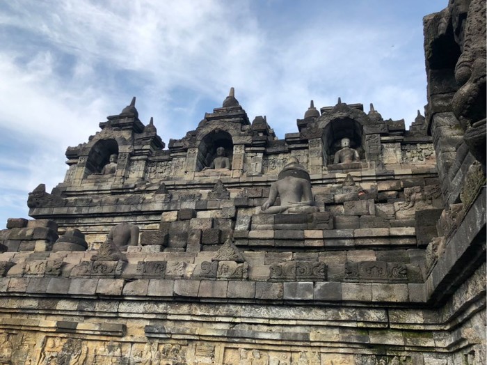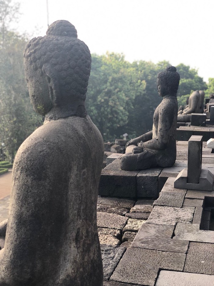 爪哇的婆罗浮屠在梵文中意为"山丘上的佛塔",是世上建筑面积最大的佛教建筑遗址,与中国的长城、印度的泰姬陵、柬埔寨的吴哥窟并称为古代东方四大奇迹。佛塔由当地火山岩建造而成,共供奉了504尊佛像。建筑共十层,三部分,分别为欲界(充满各色欲望),色界(追求感官享受)和升华的无色界(摆脱肉体,追求精神愉悦)。顺着回廊层层向上攀登,沿途欣赏到不计其数的壁画雕刻,主要记录了当时社会的生活百态,工艺繁复精湛,主要表现了恶有恶报,善有善报的主题。
