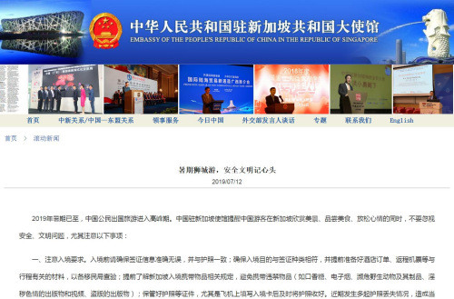 @中国侨网:据中国驻新加坡大使馆网站消息,2019年暑期已至,中国公民出国旅游进入高峰期。中国驻新加坡使馆提醒中国游客在新加坡欣赏美景、品尝美食、放松心情的同时,不要忽视安全、文明问题,尤其注意以下事项: