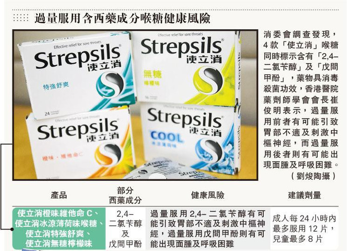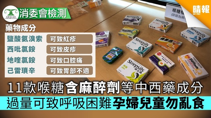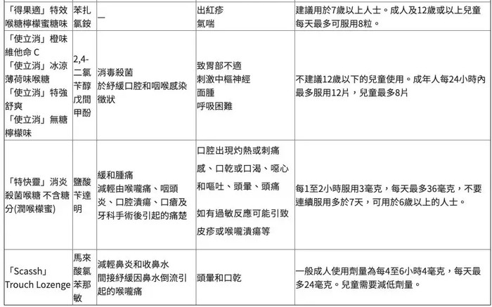 还有这款特快灵消炎杀菌润喉糖,该款样本含有「盐酸苄达明」成分,服用后可能会引致口腔灼热或刺痛、恶心和呕吐、头晕及头痛等副作用,若对非类固醇消炎药有过敏反应的人士,服用后可引致皮疹或喉咙溃疡。