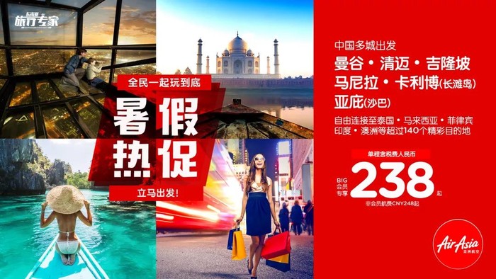 亚航本周暑假热促,国内多城出发曼谷/清迈/吉隆坡/马尼拉/沙巴等几十个目的地,单程含税人民币238元起~