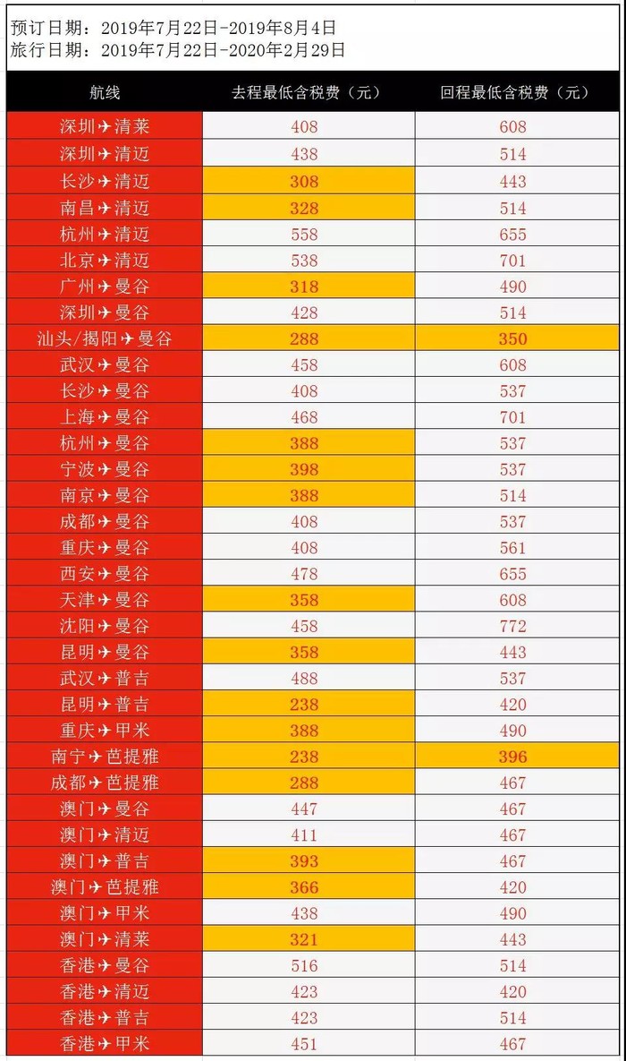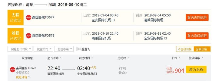 深圳=清莱,往返含税904元;