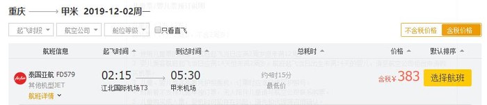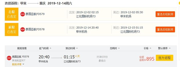 重庆-甲米,单程含税383元;单程含税895元;