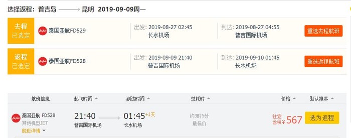 昆明=普吉岛,单程含税232元,往返含税567元;