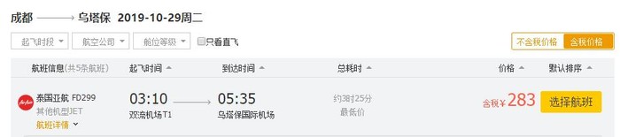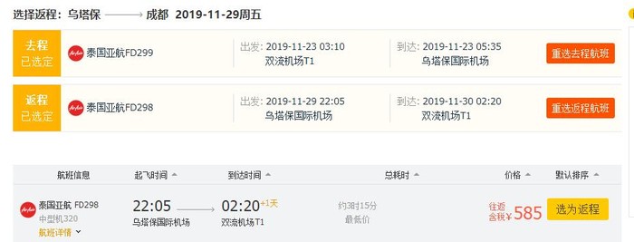 成都=芭提雅,单程含税283元;往返含税585元;