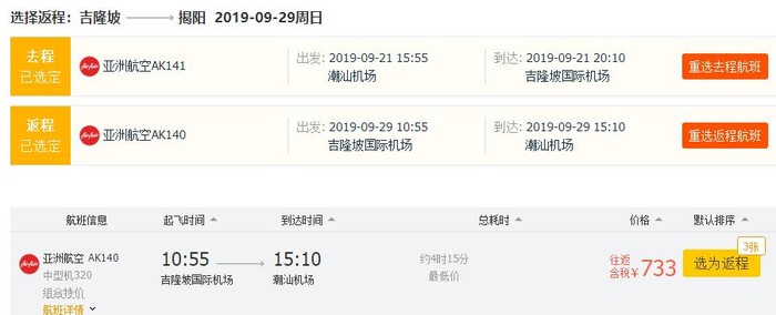 揭阳=吉隆坡,往返含税733元;