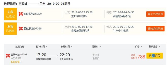 兰州=吉隆坡,往返含税788元;