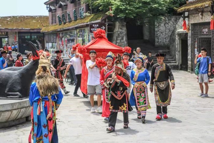 江油—九皇山—云中羌寨索道—西羌广场—羌情园索道—后山网红玻璃栈道—羌情园—云中农场—尔玛古道—高空表演—羌情园索道—前山观音崖—情人桥—猿王洞—返回起始地