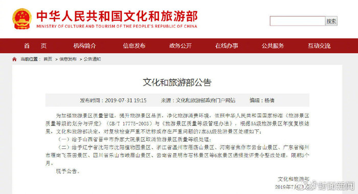 @封面新闻:根据5A级旅游景区年度复核结果,文化和旅游部日前决定,对复核检查严重不达标或存在严重问题的7家5A级旅游景区处理如下:①给予山西省晋中市乔家大院景区取消旅游景区质量等级处理;②给予辽宁省沈阳市沈阳植物园景区、浙江省温州市雁荡山景区、河南省焦作市云台山景区、广东省梅州市雁南飞茶田景区、四川省乐山市峨眉山景区、云南省昆明市石林景区等6家景区通报批评责令整改处理,限期3个月。