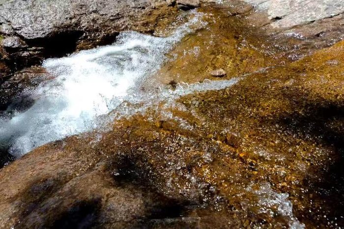 路闻水声,循声而觅,拨开层层枝桠,只见一泓清澈透亮的山泉,正拍击凹凸的石头,一片翻腾的白色水花激起,清凉之意,顿上心头。