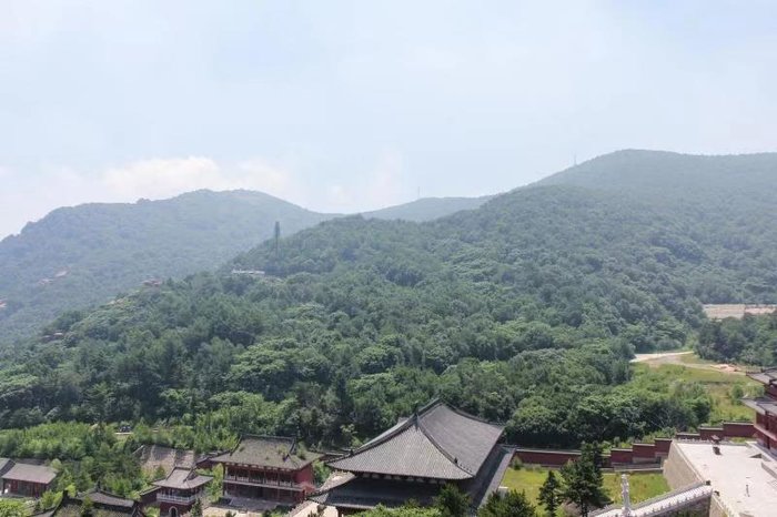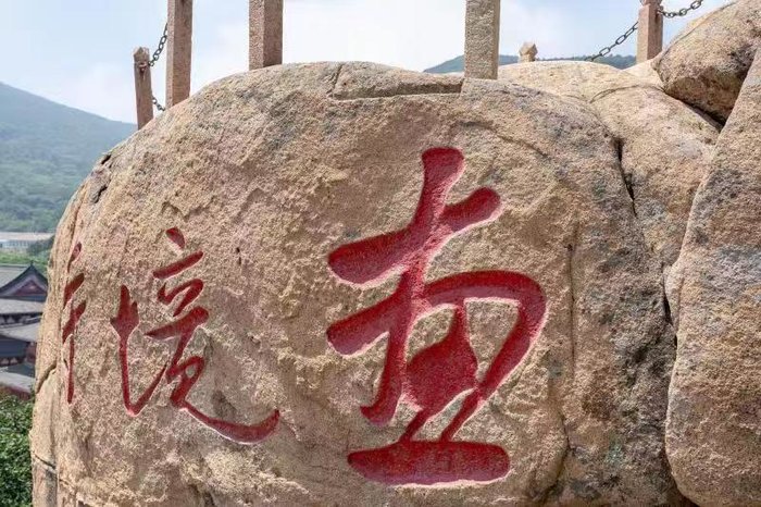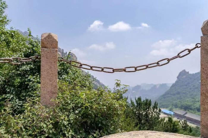 下了缆车,一块奇石盘踞在行走的小路边际,几块奇石互相交叠着,上面还有碑石柱和铁索。从这看下去,可直接看到山海禅寺,此时的禅寺也别有一番风味。禅寺很大,即使我们只是在高处观望。