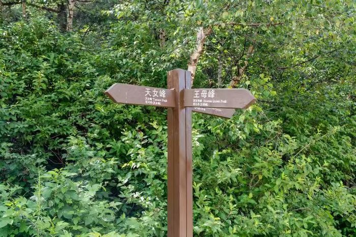 继续往前走,来到天女峰路标处,在王母峰方向。这个路标的出现,意味着我们的爬山之旅也开始了。这次的爬山旅途还是需要有一定的运动基础,大部分人都选择索道上山,徒步下山。现在来开启爬山之旅吧!