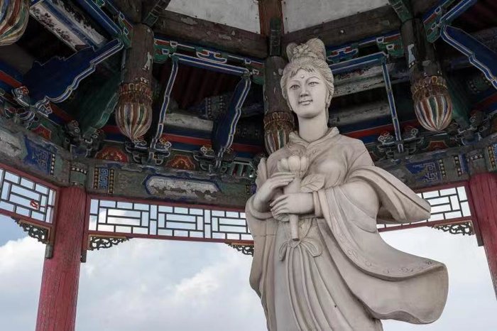 终至天女亭,亭子顶修饰着很多的花纹,看起来很有神彩。一座天女像雕塑立于亭中,她的面部表情细腻生动,裙摆风扬,充满动态美感,衣着也很有历史特点。环顾四周,群峰环绕,皆不及天女峰。傲视群雄、心情激荡、豪迈。