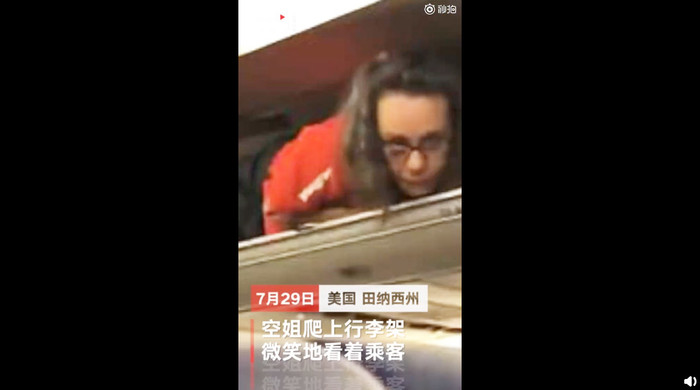 空姐趴行李架对乘客笑 航空公司:只是在开玩笑