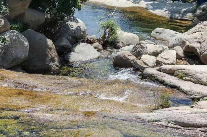 继而下行,渐渐走着,路闻水声。果然,几处下坡之后就是一条木制的桥。木桥很稳,敦厚扎实的结构,让人走着安心,虽然不宽,但是因为来人少,倒也不显得局促。从桥走过,可以观赏到大大小小的奇石,以及清水流过的美丽。奇石的磅礴和流水的婉约相结合,形成一种独特的美。